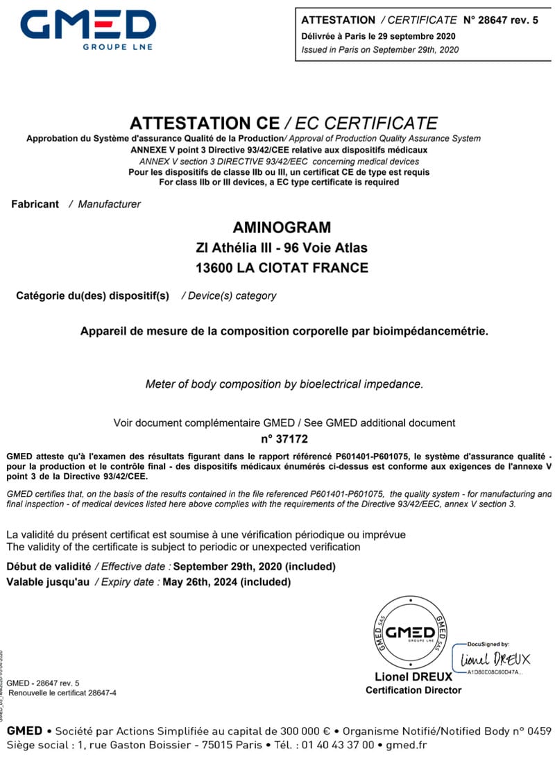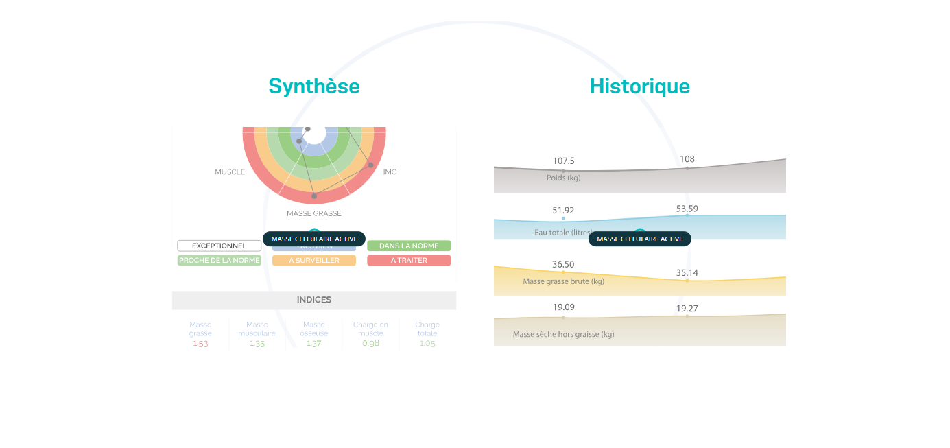 Par un système de courant sinusoïdal, alternatif et de faible intensité, la BIA ou Bio Impédancemétrie apporte une mesure de la conduction et de l’opposition des différents tissus du corps au passage du courant. Cela permet, par exemple, d’évaluer l’eau, la masse maigre, la masse musculaire, la masse grasse… Des composantes indispensables à une mesure précise, tenant compte des spécificités individuelles des patients.