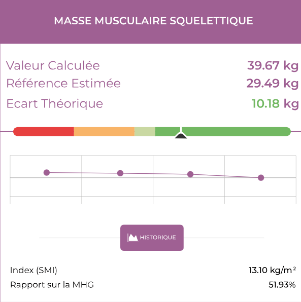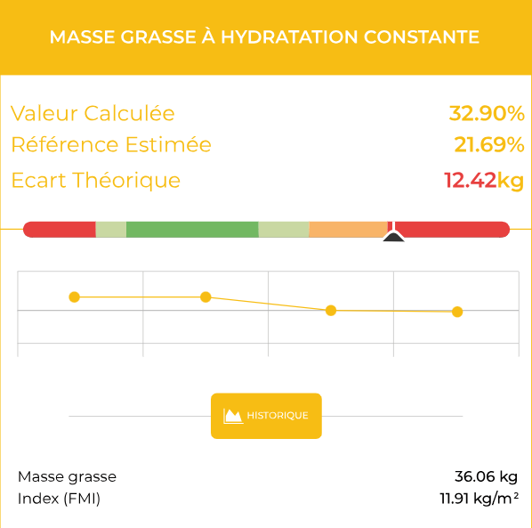 Grâce à l’analyse par Bio Impédancemétrie, ou BIA, c’est l’ensemble de la composition corporelle qui est prise en compte par l’évaluation de la masse musculaire, du contenu minéral osseux, du volume d’eau… La graisse agissant comme un isolant face au courant électrique, elle sera déduite par soustraction de la masse hors graisse du poids total.