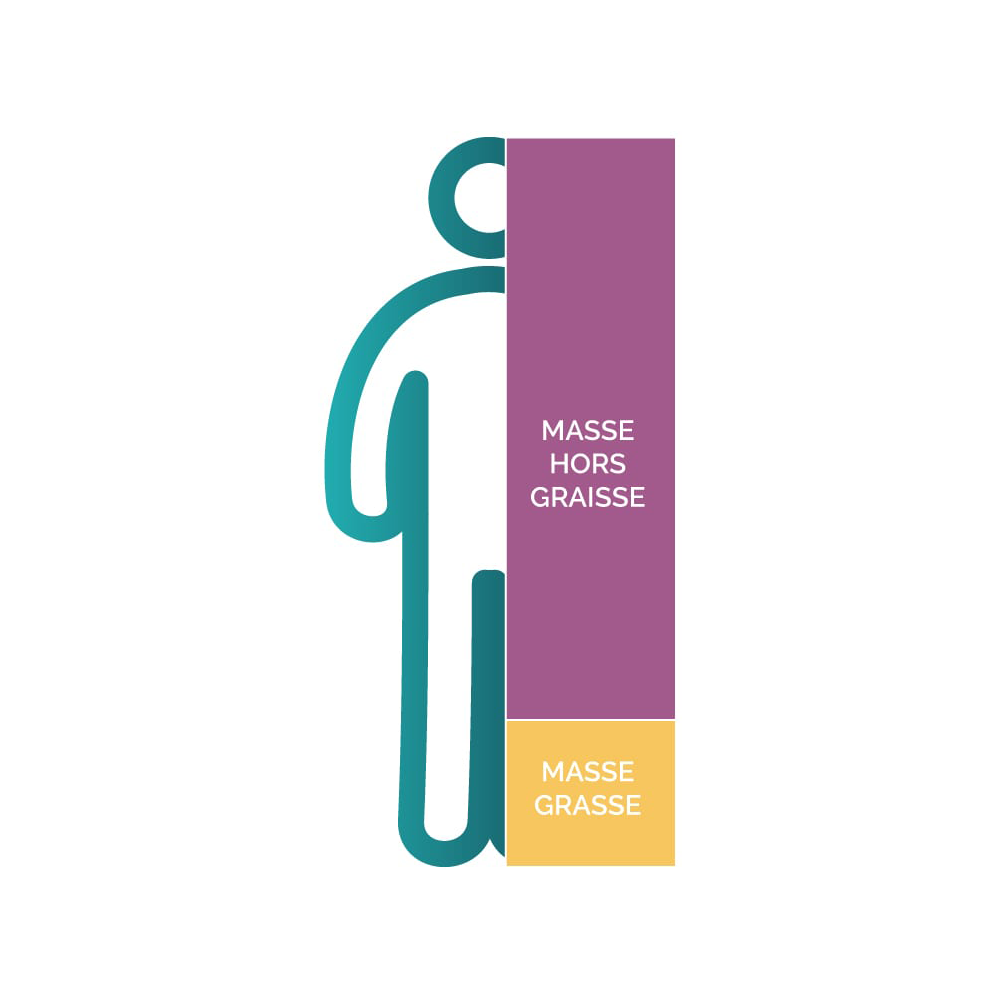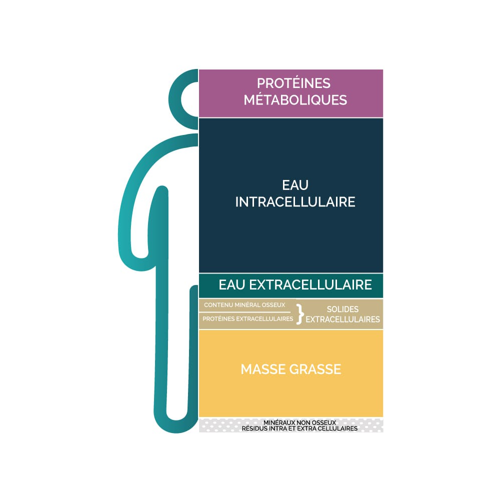 • 1 à 3 compartiments : les fluctuations d’eau chez l’individu entraîneront systématiquement des variations sur la masse grasse et la masse musculaire.
