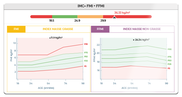 La tuile imc situe le sujet par rapport à une population de référence via deux index (fmi : masse grasse, ffmi : masse non grasse), exprimés en kg/m².