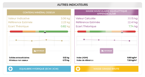 Ce module permet de suivre des indicateurs essentiels : contenu minéral osseux, équilibre hydrique, hydratation hors graisse, masse musculaire et masse grasse.